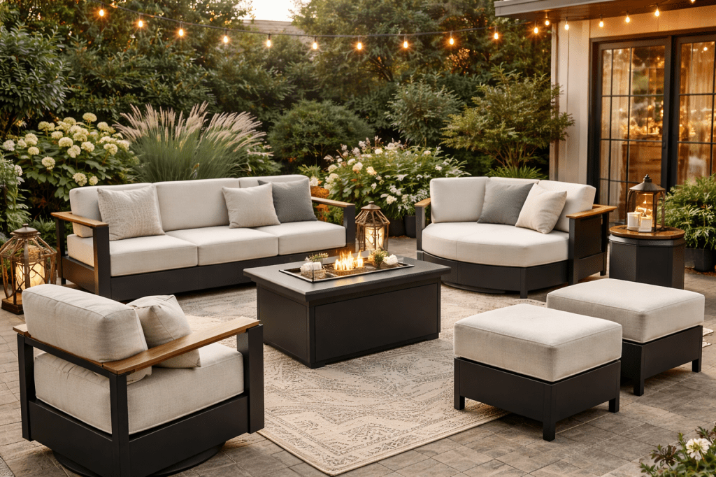 Modern patio furniture collections, like the sleek black metal and dove cushion set featured in this design, make it easy to create a space that feels both stylish and comfortable. Whether you’re enjoying your morning coffee, hosting friends for summer evenings, or simply unwinding after a long day, a well-designed patio can quickly become your favorite place to relax.